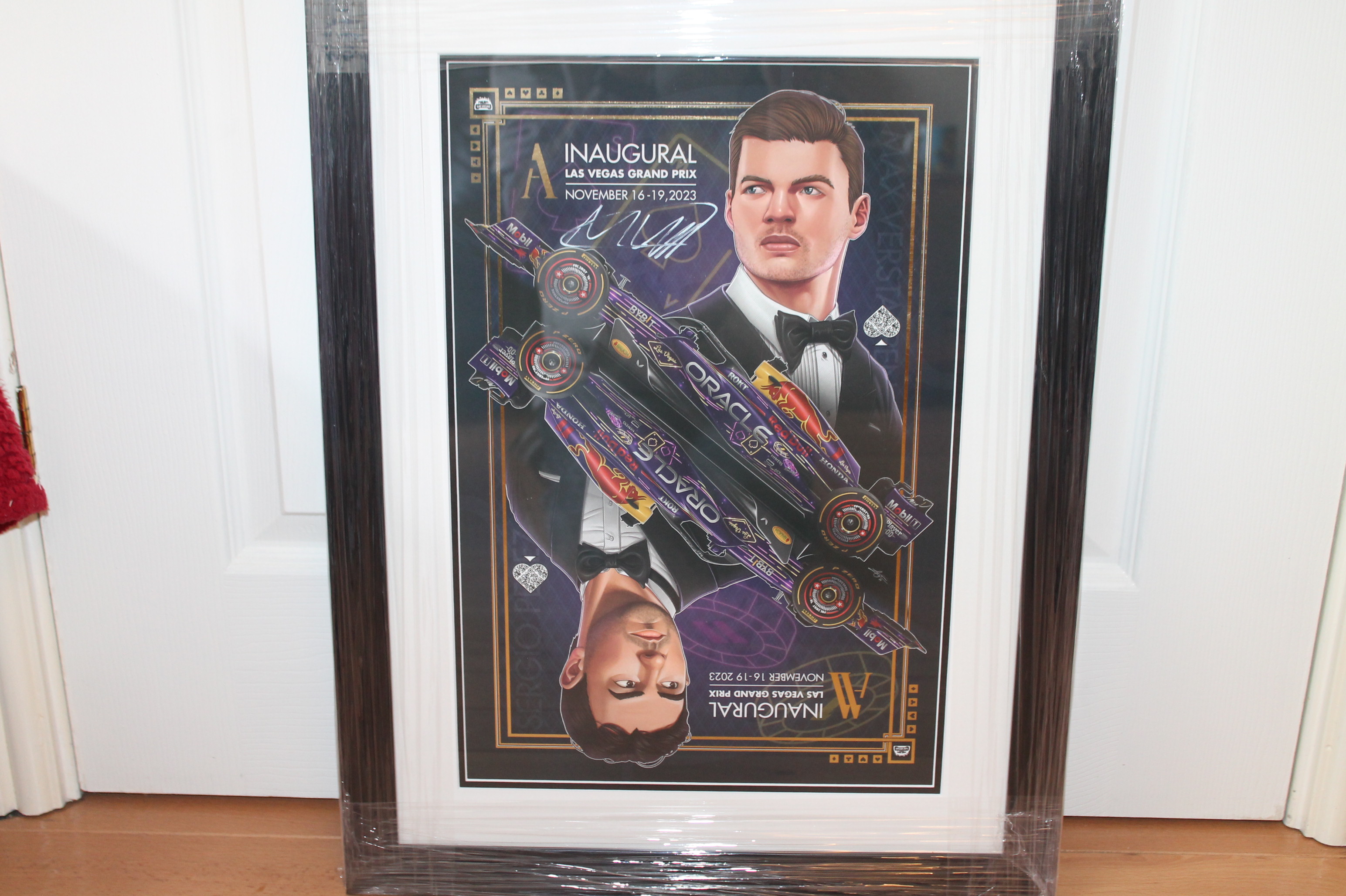 Official Commemorative Poster from the 2023 inaugural Vegas Grand Prix, hand signed by Max Verstappen in silver