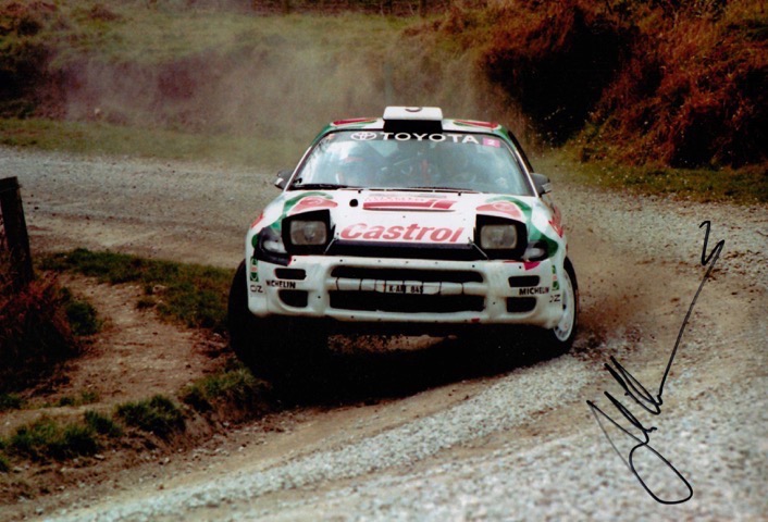 A4 Picture of Yuha Kankkunen in his Toyota hand signed by Yuha Kankkunen.