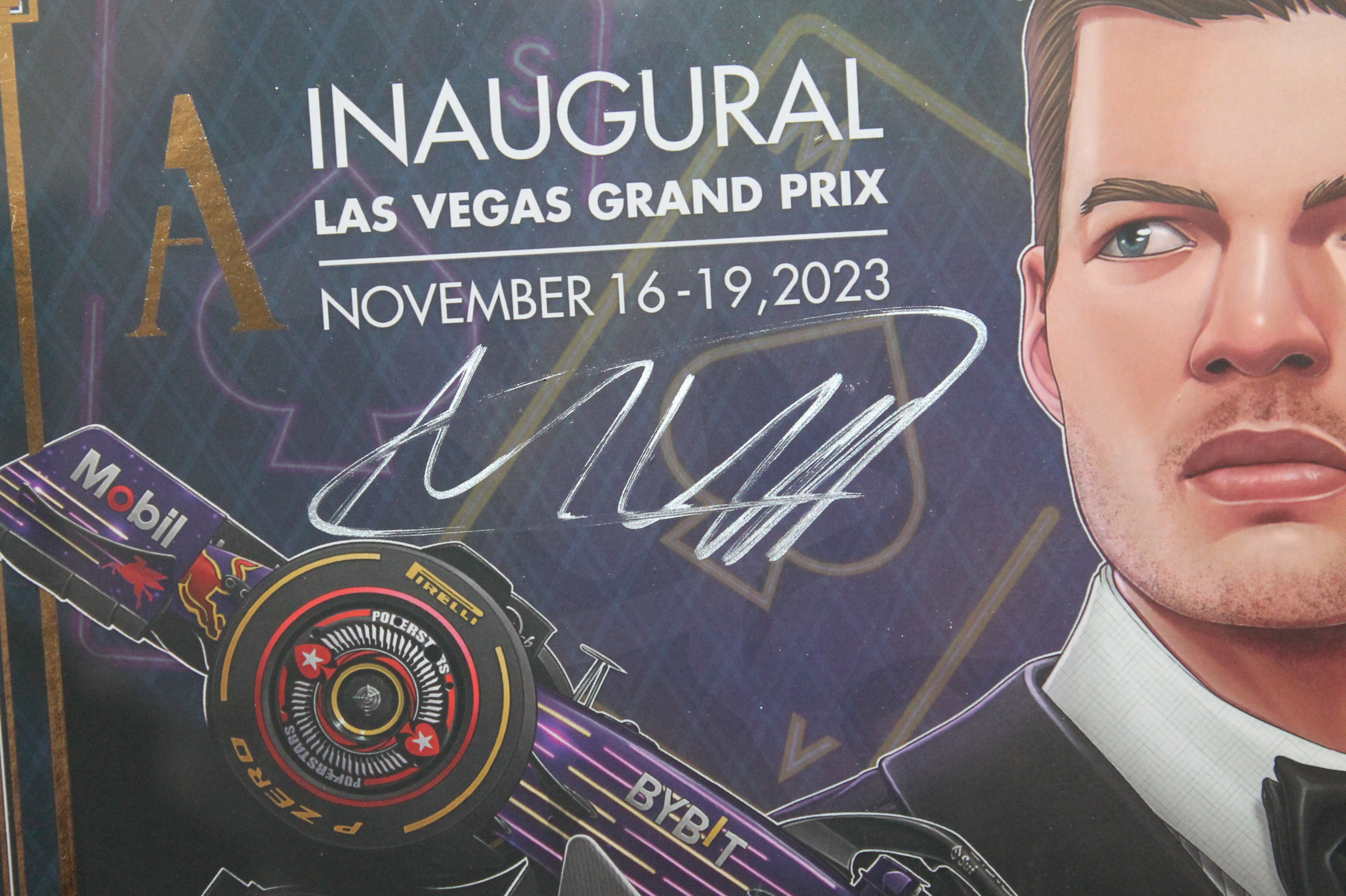 Official Commemorative Poster from the 2023 inaugural Vegas Grand Prix, hand signed by Max Verstappen in silver